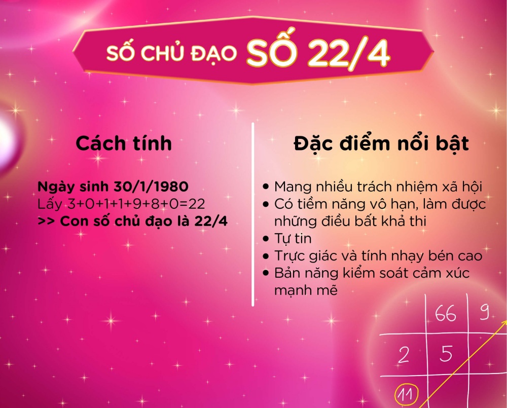 Đây là con số đặc biệt, được trường phái Thần số học Pitago coi là “Con số vua”. Người mang Con số chủ đạo 22/4 có tiềm năng gần như vô hạn và thường đạt được hầu hết những mục đích có vẻ bất khả thi.