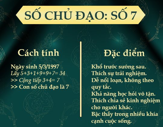 Những người có ngày sinh cộng lại thành số tổng là 16, 25, 34, 43 sẽ có Con số chủ đạo là số 7.